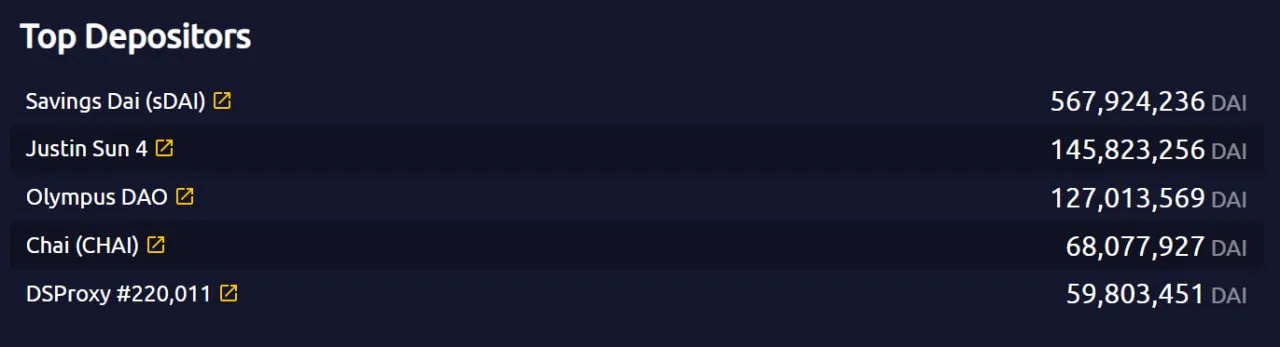 The top depositors in the DSR contract. Source: Makerburn.com